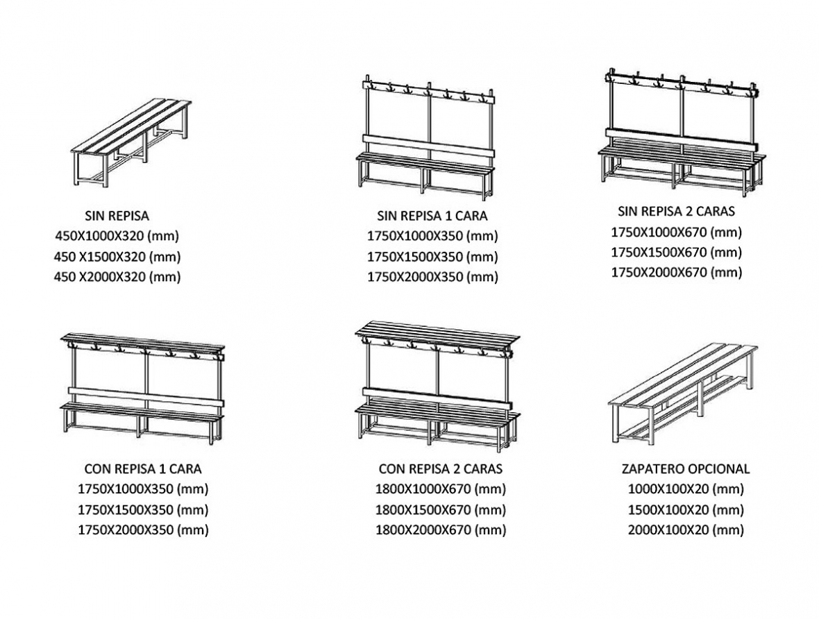 Preparados para espacios dinámicos y deportivos, los bancos de trabajo se dividen en dos grandes grupos: los de lamas de DM bilaminado maple y los de lamas de madera de pino.